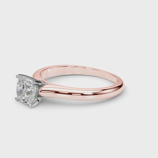 This cathedral Cushion solitaire features a Tiffany head with 4 prongs to secure the gemstone. The petite band adds to the dainty and timeless look of this engagement ring.