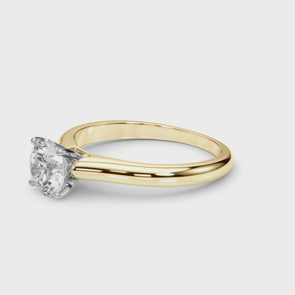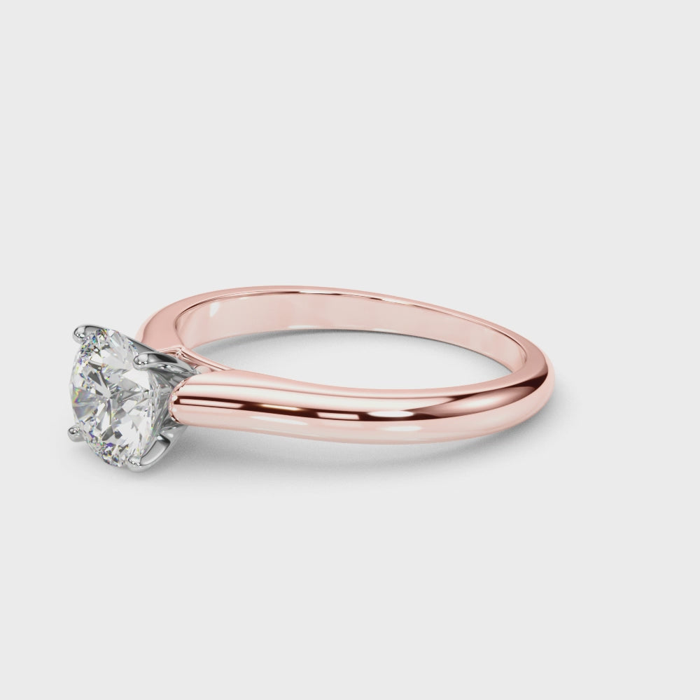 This cathedral Round solitaire features an open basket with 4 claw prongs to secure the diamond, size of your choice. The petite band adds to the dainty and timeless look of this engagement ring.