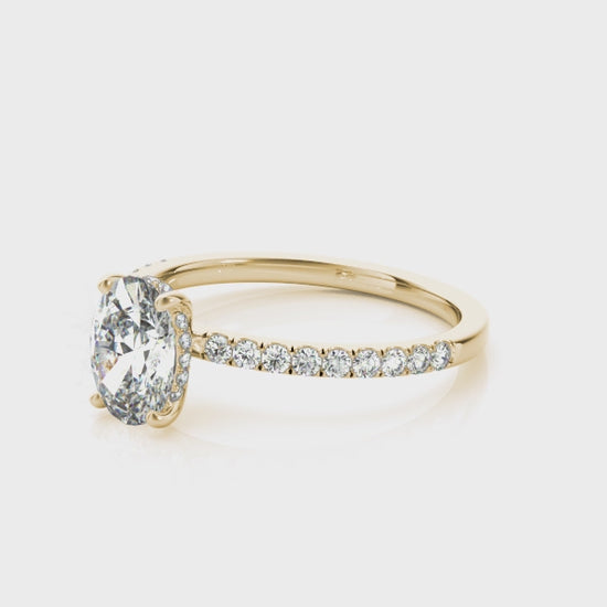This elegant and petite ring features an oval diamond, size of your choice with lab diamonds extending halfway around the band and a hidden halo (1/4 total carat weight). The diamond will be cradled with 4 prongs creating a classic and sparkling ring.
