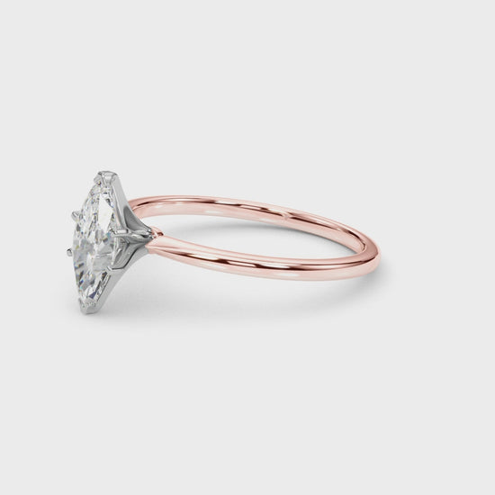 This classic Marquise solitaire features a diamond of your choice. The petite band adds to the dainty and timeless look of this engagement ring.
