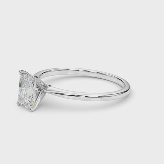 This classic Radiant solitaire features a diamond of your choice. The petite band adds to the dainty and timeless look of this engagement ring.